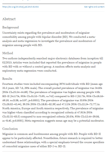 Fornaro M, Stubbs B. A meta-analysis investigating the prevalence and moderators of migraines among people with bipolar disorder. J Affect Disord. Jun 01 2015;178:88-97.